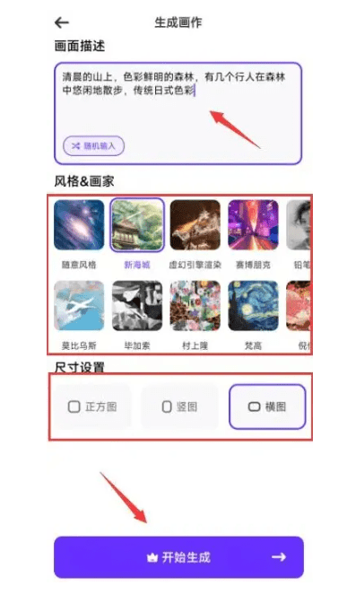 之后我们正在‘生成画做’界面中输入你心目中丹青的描述消息,打开软件!